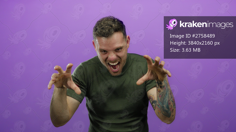 Young man with tattoos smiling and posing playfully against a vibrant purple background, showcasing tattooed arms and a green shirt.