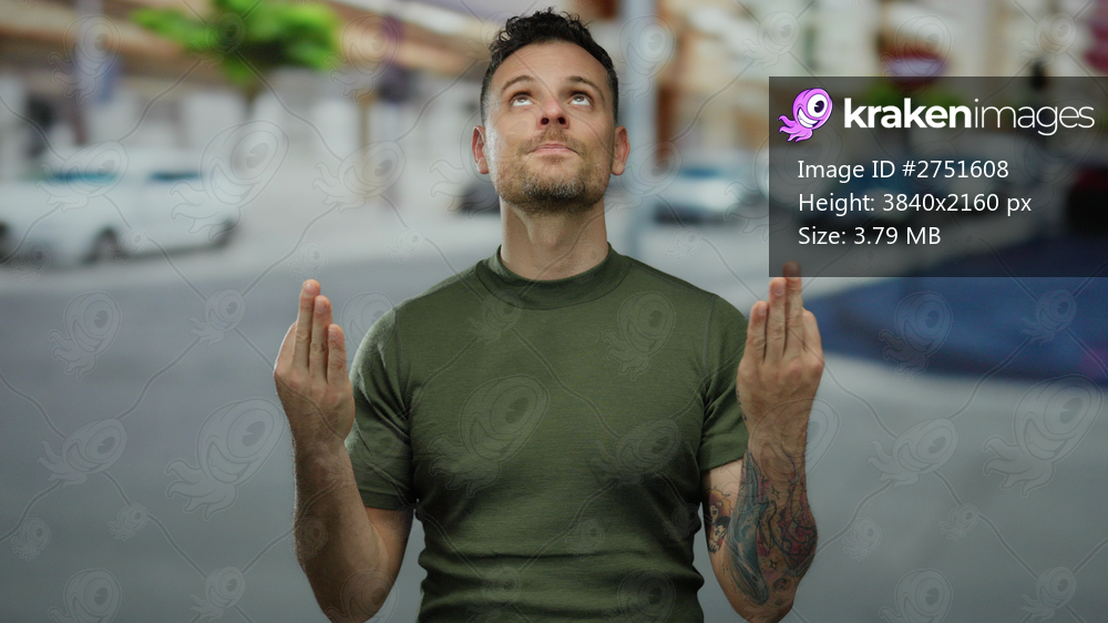 Young man with tattoos stands on urban street looking thoughtful in casual attire surrounded by cars and buildings under clear sky