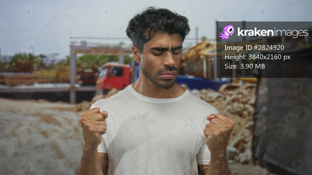 Young man tilting head back with closed eyes and bare arms raised while clenching fists at sunlit building site; relief.
