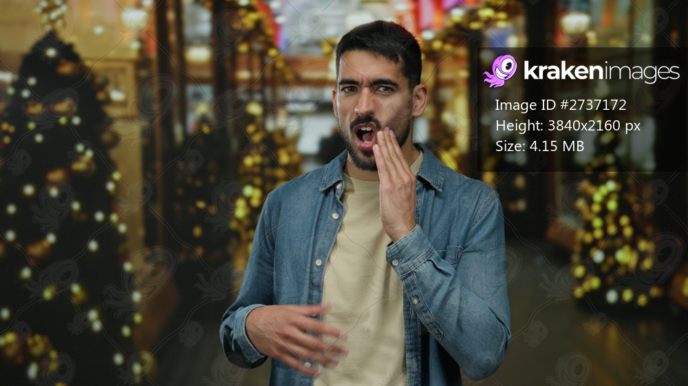 Young man with toothache on urban street, surrounded by festive christmas lights, feeling discomfort while holding his jaw in a bustling city environment. - Kraken Images