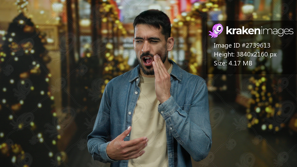 Young man with toothache on urban street, surrounded by festive christmas lights, feeling discomfort while holding his jaw in a bustling city environment. - Kraken Images