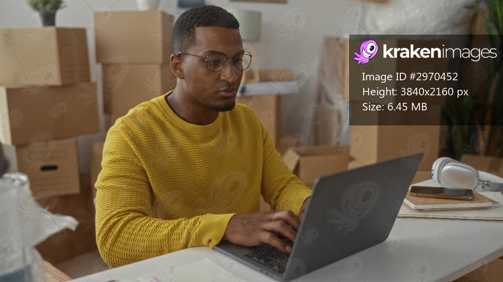 Young man typing on laptop with visible hands at table amid moving boxes in building; focused productivity.