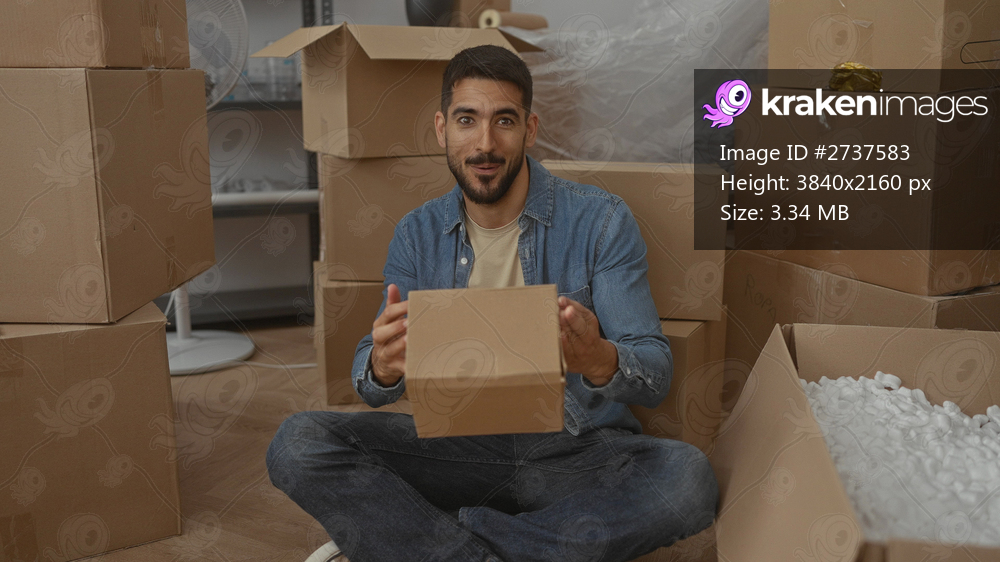 Young man unpacking boxes in new apartment surrounded by cardboard, looking excited and curious, wearing casual denim and seated on wooden floor.