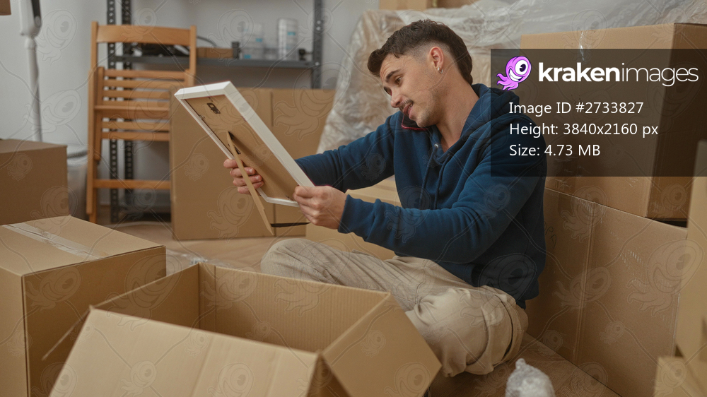 Young man unpacking boxes while talking on phone in new apartment, surrounded by cardboard, wearing casual clothes, showing excitement, reflecting modern lifestyle in city. - Kraken Images
