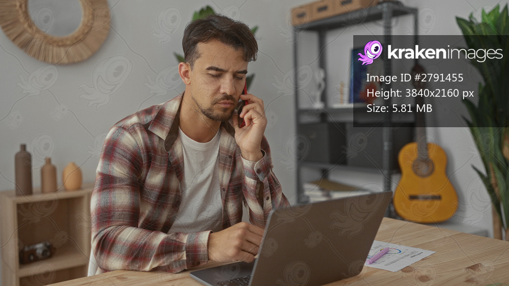 Young man using laptop in office, talking on phone with thoughtful expression, surrounded by shelves and plants, conveying a casual work environment.