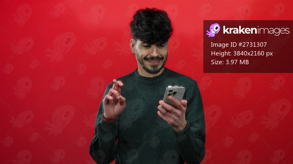 Young man using smartphone crossing fingers over red background looking optimistic and hopeful.