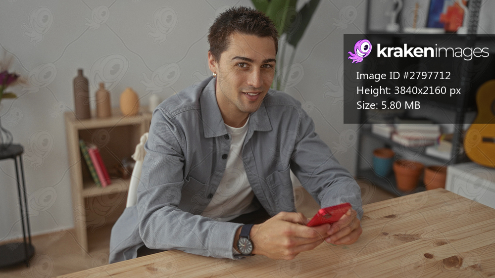 Young man using smartphone in cozy living room with guitar and bookshelves, wearing casual jacket while seated at wooden table in bright apartment interior. - Kraken Images