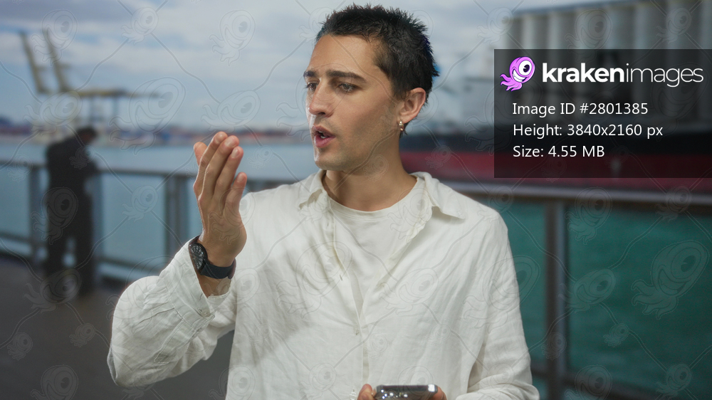 Young man using smartphone on a cruise ship by the seaside with industrial port and ocean in the background.