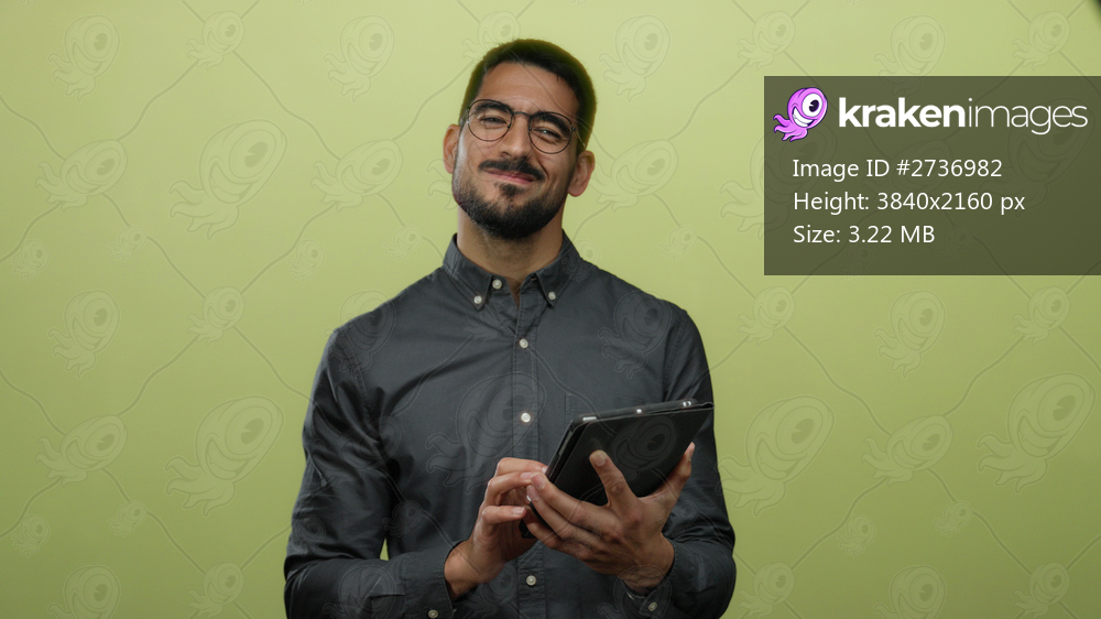 Young man using tablet over green background, wearing glasses, looking focused while holding device with both hands, presenting concept of technology and connectivity. - Kraken Images