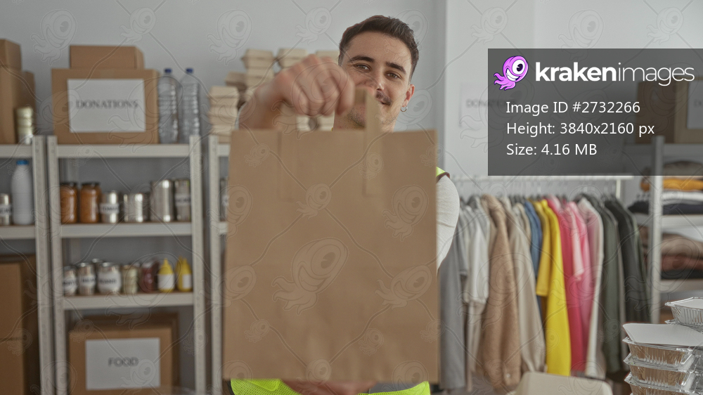 Young man volunteer with reflective vest holds paper bag in indoor charity donations center surrounded by shelves of food and clothes