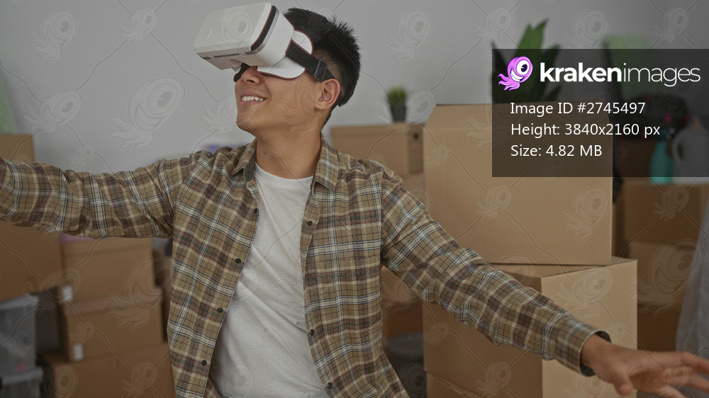 Young man with vr headset exploring in a new apartment surrounded by boxes and plants, capturing the excitement of modern technology in a moving environment. - Kraken Images