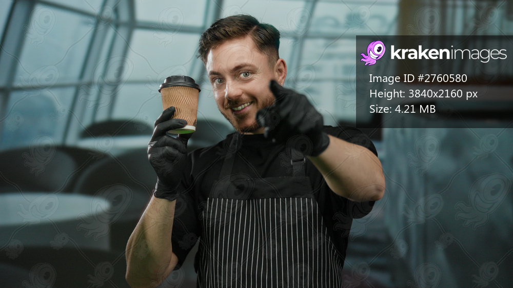 Young man waiter with beard in apron and gloves holds coffee cup indoors in restaurant setting.