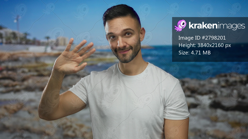 Young man waves at beach with ocean and rocks under sunny sky, conveying a friendly and relaxed outdoor vibe.