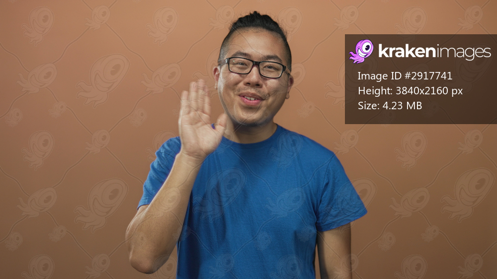 Young man waving hand at camera in studio with brown wall, wearing blue t shirt and glasses; friendly greeting.