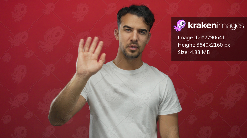 Young man waving hand confidently against vibrant red background, wearing casual white shirt, showcasing friendly greeting gesture with focus on communication and human connection. - Kraken Images