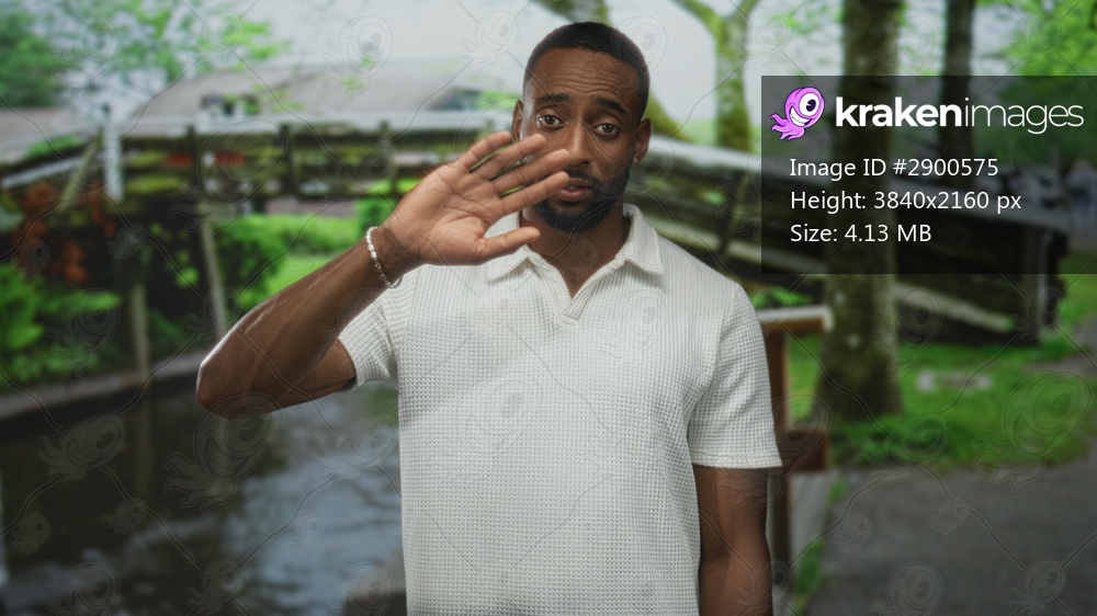 Young man waving hand on canal street in amsterdam near wooden bridge and water, wearing white polo shirt and bracelet; friendly greeting.