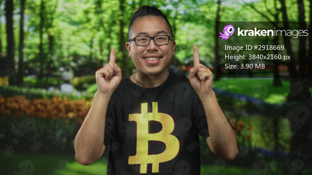 Young man wearing a black bitcoin t shirt smiles and points his index fingers upward in a sunlit forest park with green trees and lawn; crypto optimism. - Kraken Images