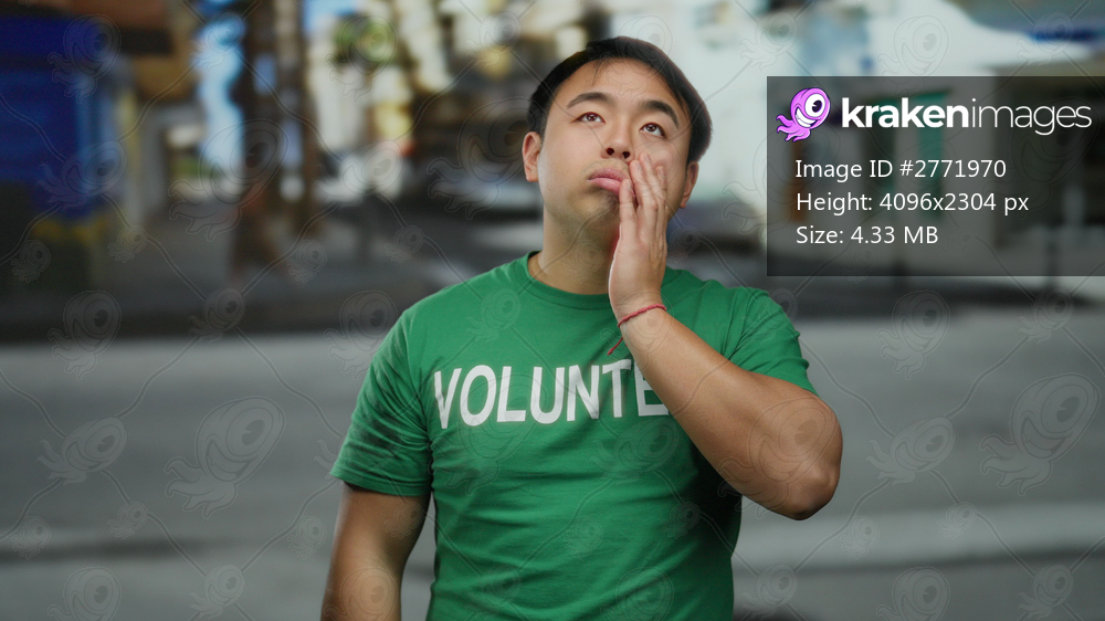 Young man wearing a green volunteer shirt looks thoughtfully while standing on a bustling city street with blurred buildings in the background.