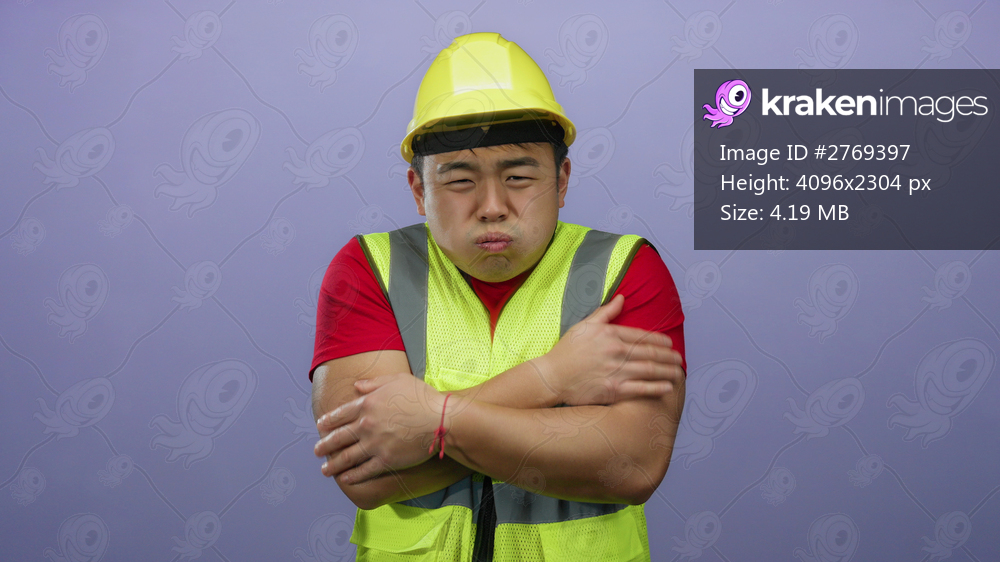 Young man wearing a hardhat and safety vest appears cold in front of an isolated purple background, conveying feelings of discomfort and chill.