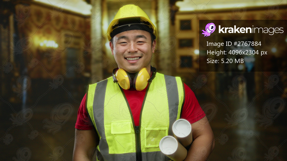 Young man wearing a hardhat and safety vest holds blueprints in a museum setting, showcasing a fusion of architecture and culture with smiling confidence indoors. - Kraken Images