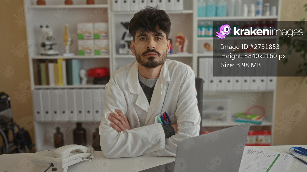 Young man wearing a lab coat sitting at a desk in a clinic surrounded by medical supplies and folders, exuding professionalism and attentiveness.