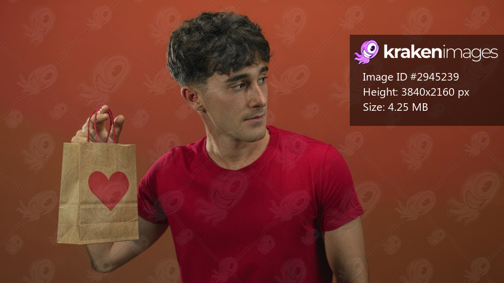 Young man wearing a red shirt holding a brown paper bag with a red heart and shushing while standing in orange studio; secrecy.