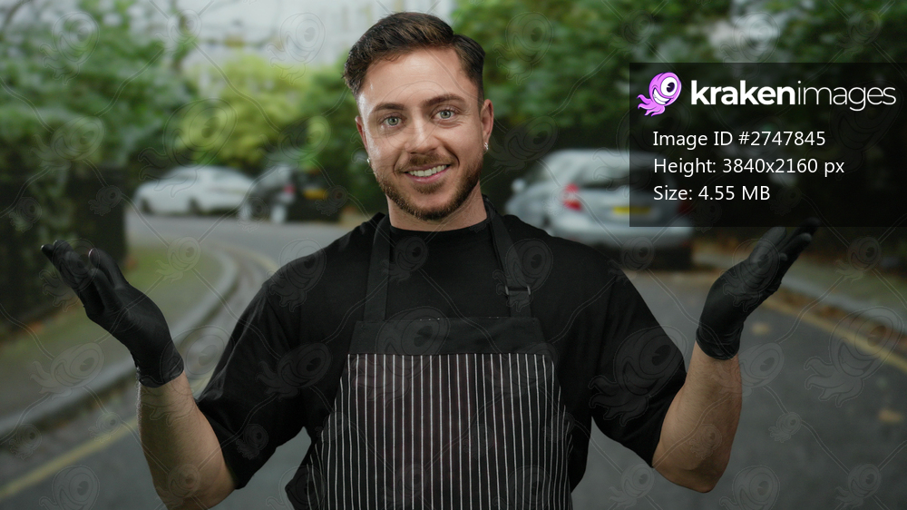 Young man wearing an apron and black gloves smiles standing on a city street with parked cars, suggesting a waiter or street vendor vibe.