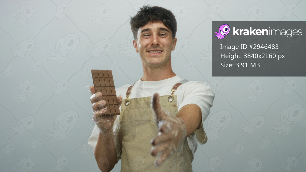 Young man wearing beige apron and plastic gloves holding a chocolate bar and offering a handshake in a light blue studio; friendly greeting.
