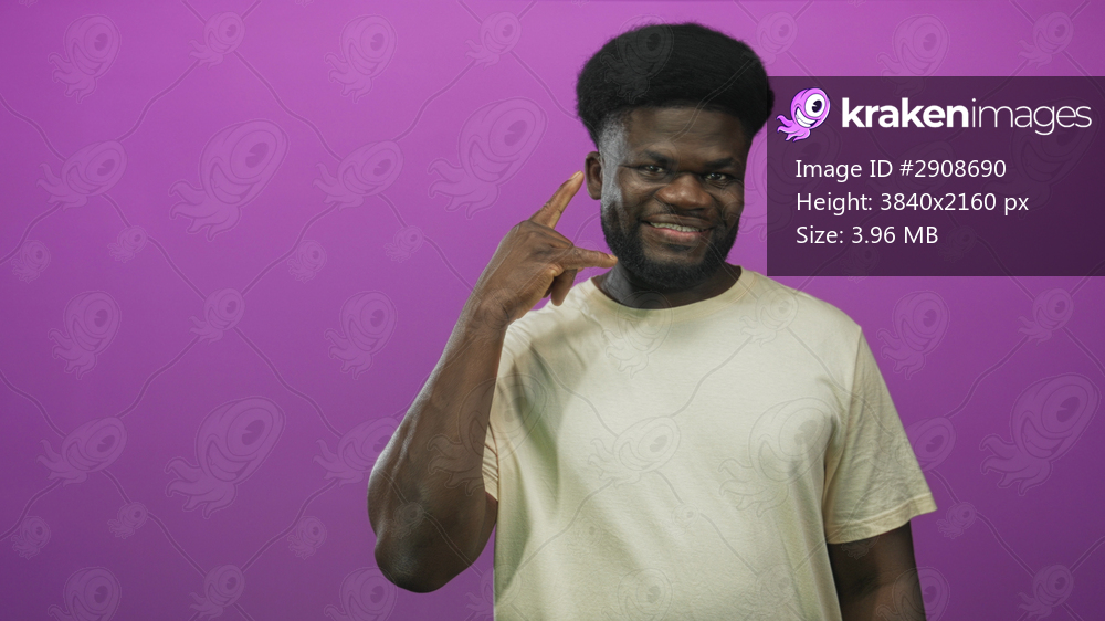 Young man wearing beige t shirt points finger at camera in studio before purple wall while smiling slightly; confident attitude.