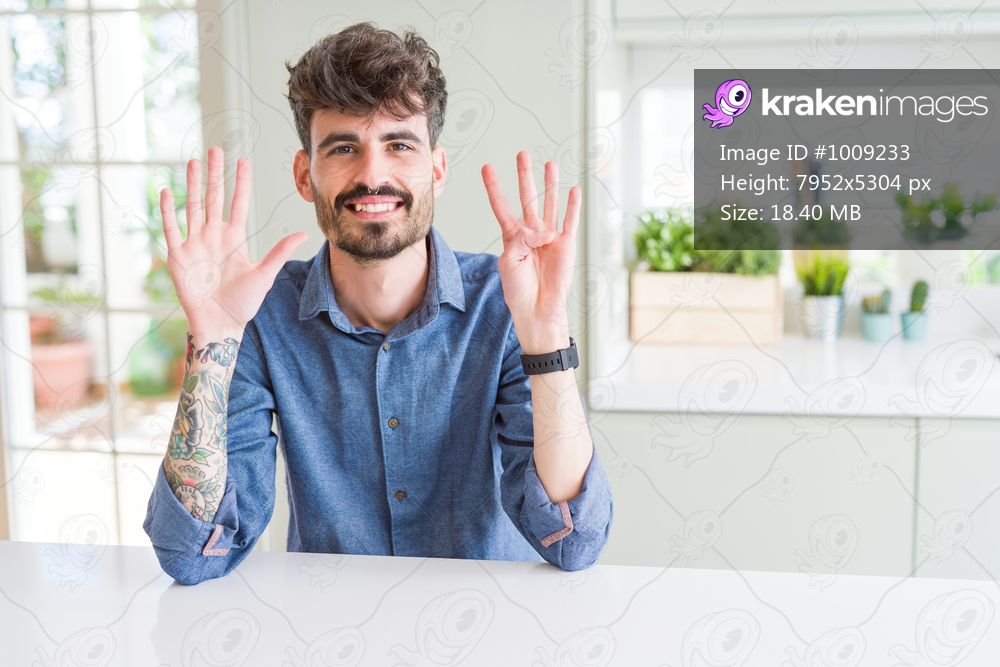 Young man wearing casual shirt sitting on white table showing and pointing up with fingers number nine while smiling confident and happy.