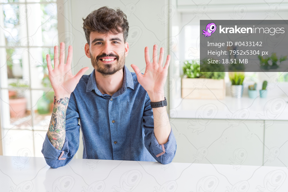 Young man wearing casual shirt sitting on white table showing and pointing up with fingers number ten while smiling confident and happy.