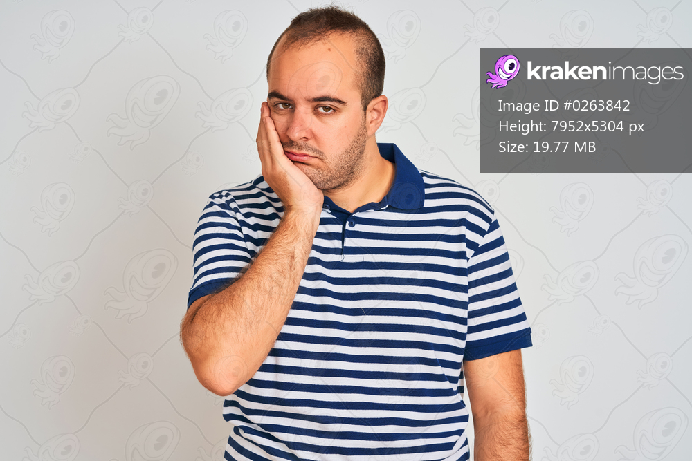 Young man wearing casual striped polo standing over isolated white background thinking looking tired and bored with depression problems with crossed arms. - Kraken Images