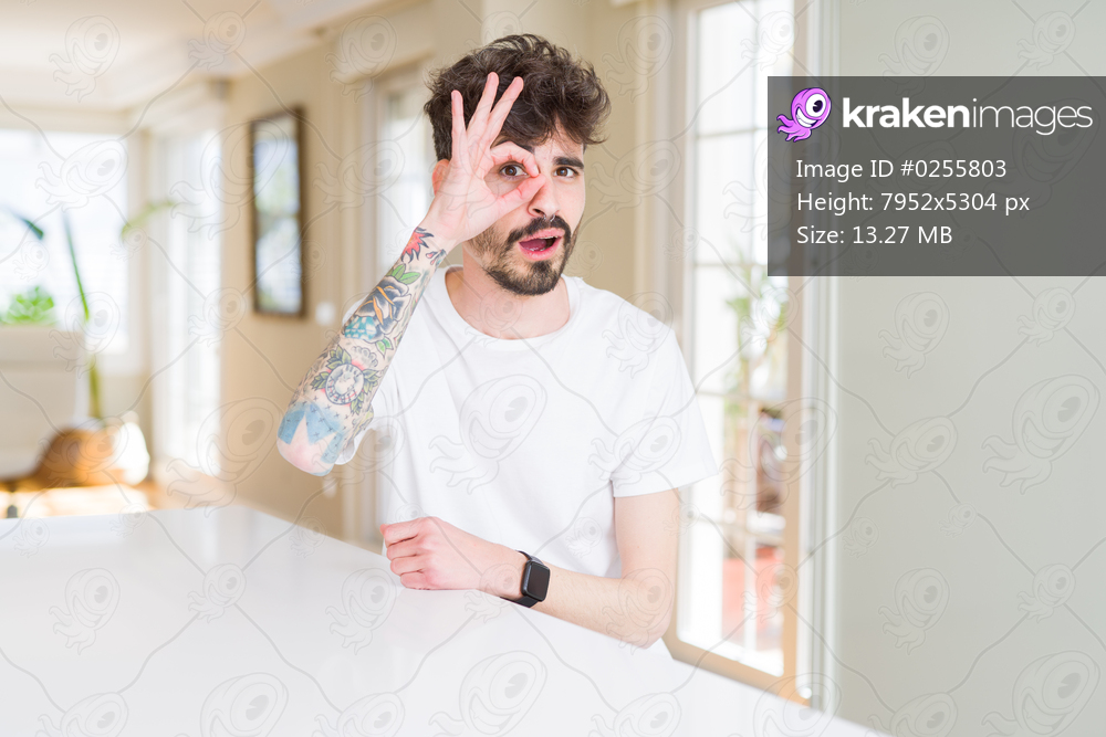 Young man wearing casual t-shirt sitting on white table doing ok gesture shocked with surprised face, eye looking through fingers. Unbelieving expression. - Kraken Images