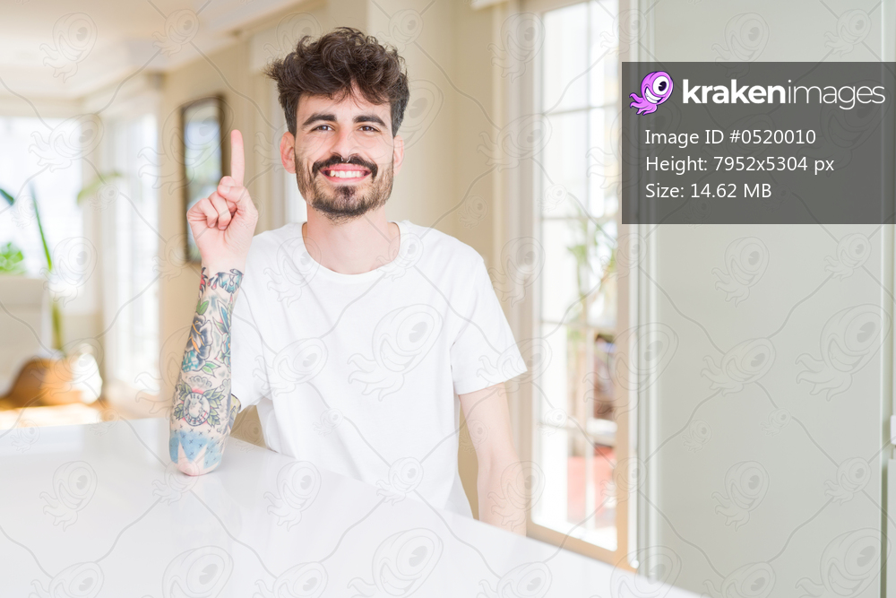Young man wearing casual t-shirt sitting on white table showing and pointing up with finger number one while smiling confident and happy.