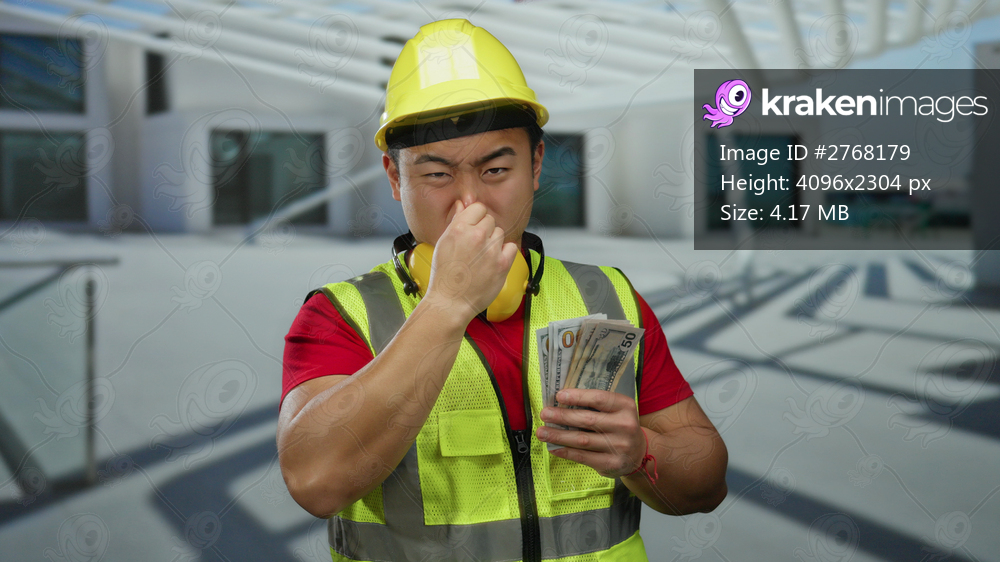 Young man wearing construction gear holding us dollars and pinching nose on a city street, suggesting an unpleasant smell in industrial urban environment. - Kraken Images