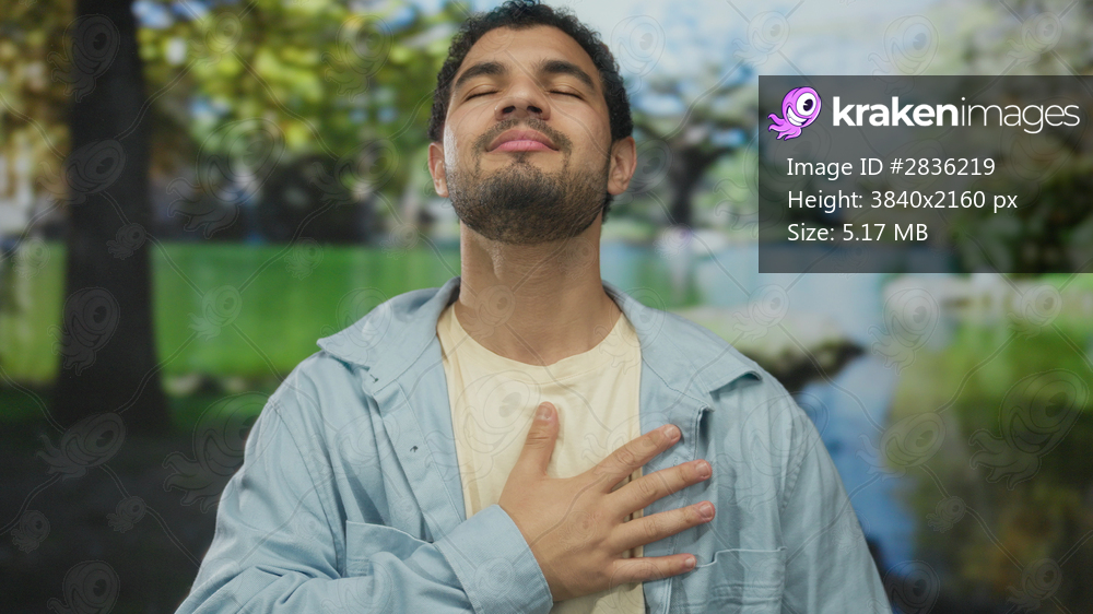 Young man wearing denim jacket holds open palms in vibrant forest by a tranquil lake overlooking lush foliage; serenity reflection connection nature.