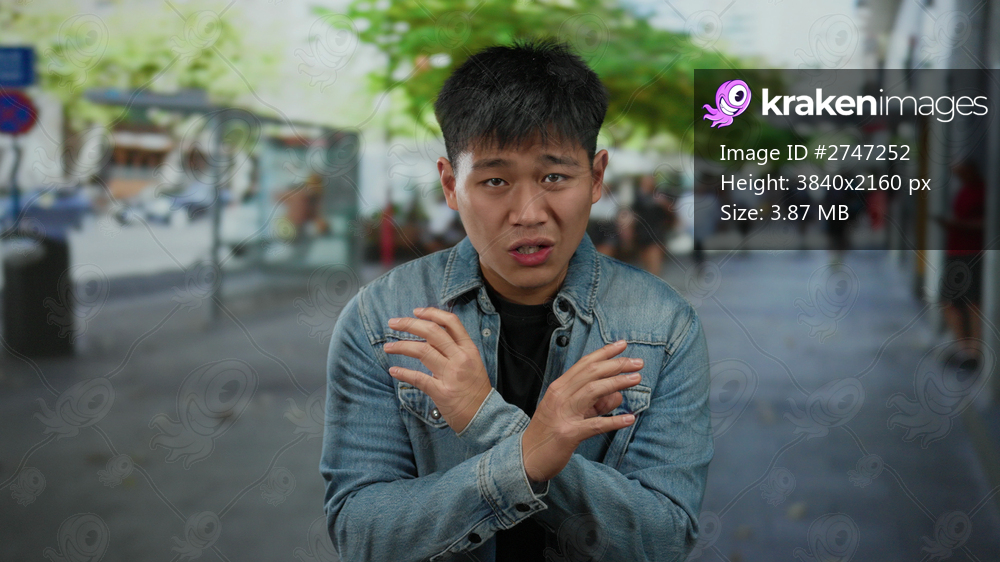 Young man wearing denim jacket stands on bustling city street, expressing emotion amid urban outdoor environment with blurred background of people and trees. - Kraken Images