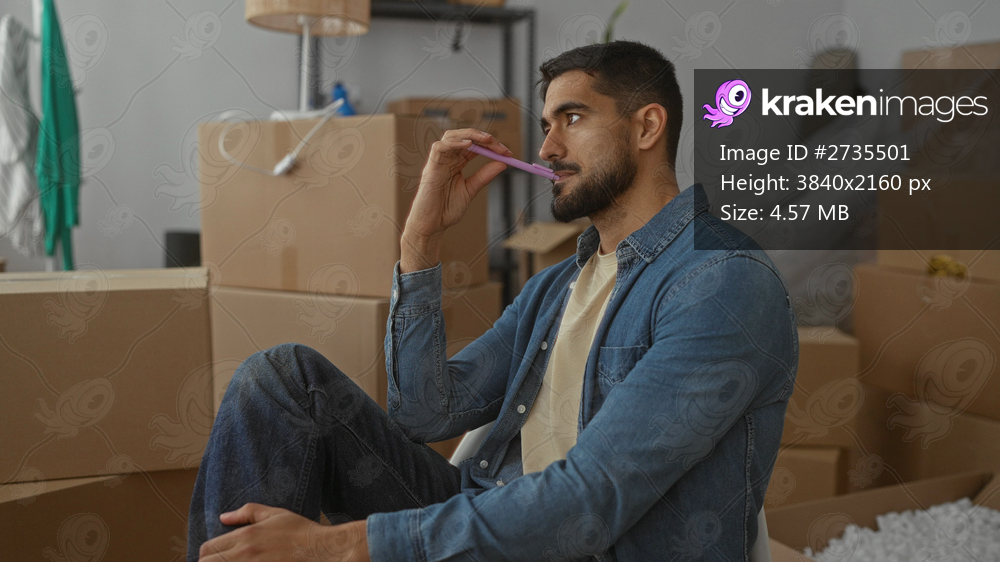 Young man wearing denim shirt sits among moving boxes in new home, contemplating while holding a pen, reflecting on future plans in living room filled with scattered items. - Kraken Images