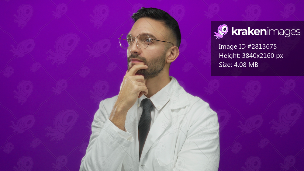 Young man wearing glasses and a white coat ponders thoughtfully against a vibrant purple background suggesting contemplation and introspection in a professional setting - Kraken Images