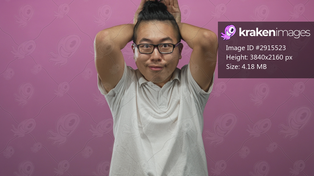 Young man wearing glasses and a white polo with hands on head holding a hair bun in a pink studio; playful curiosity.