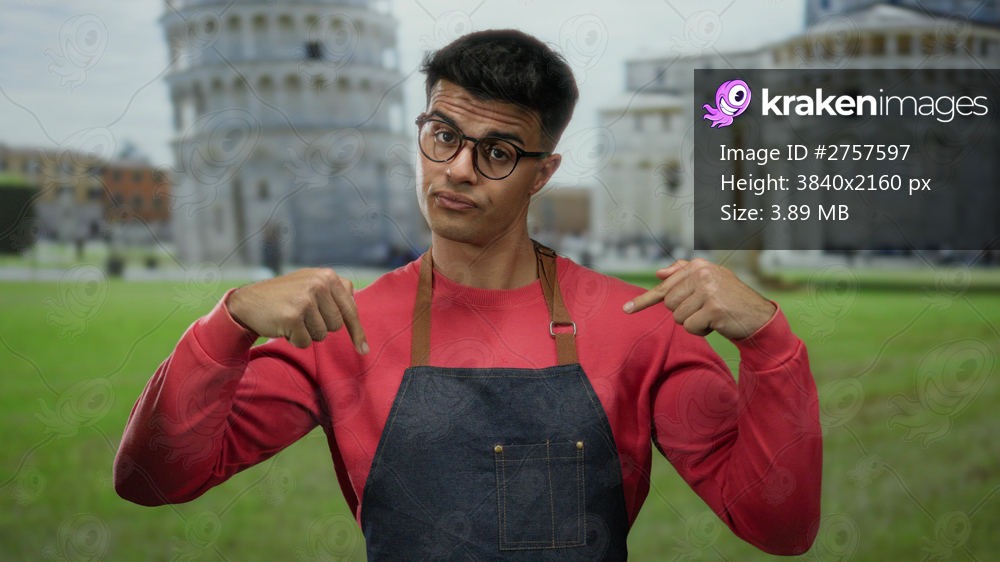 Young man wearing glasses and apron gestures in front of iconic leaning tower in lively outdoor pisa setting.