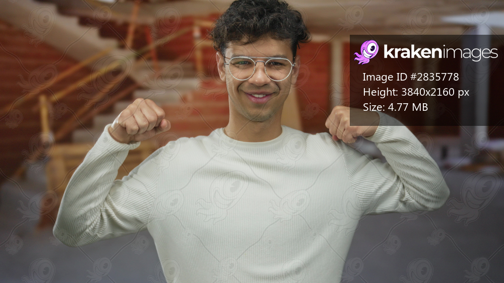 Young man wearing glasses flexes arms in unfinished building; confidence strength self belief perseverance.