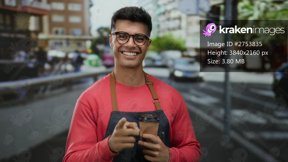 Young man wearing glasses in a red sweater holding a coffee cup and smiling outdoors on a busy city street.