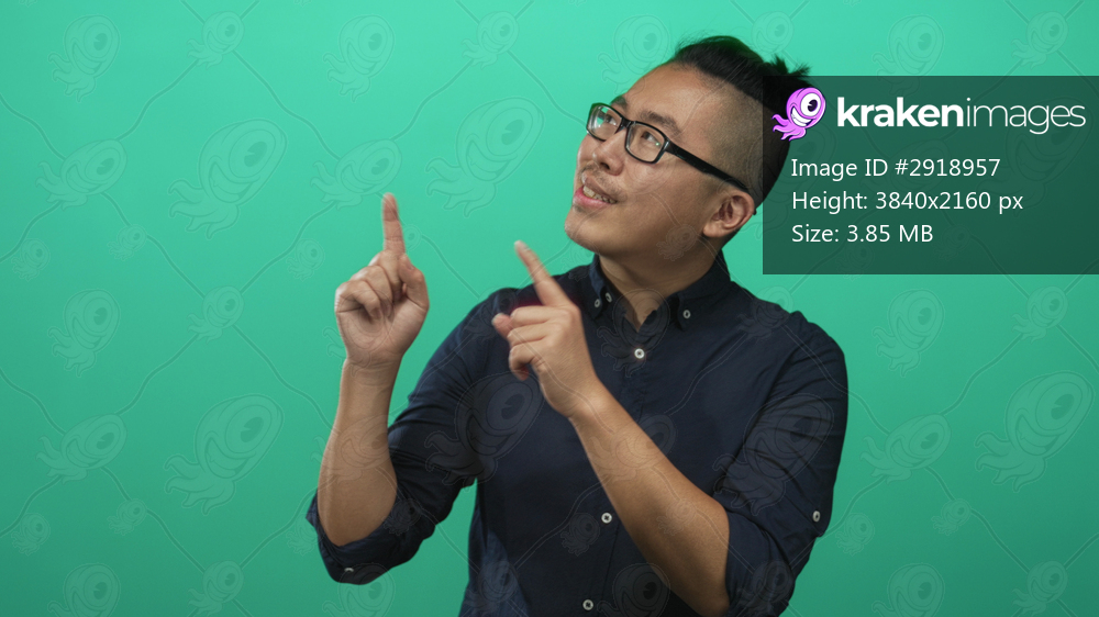 Young man wearing glasses and navy shirt pointing both index fingers upward in green studio; playful curiosity focus.