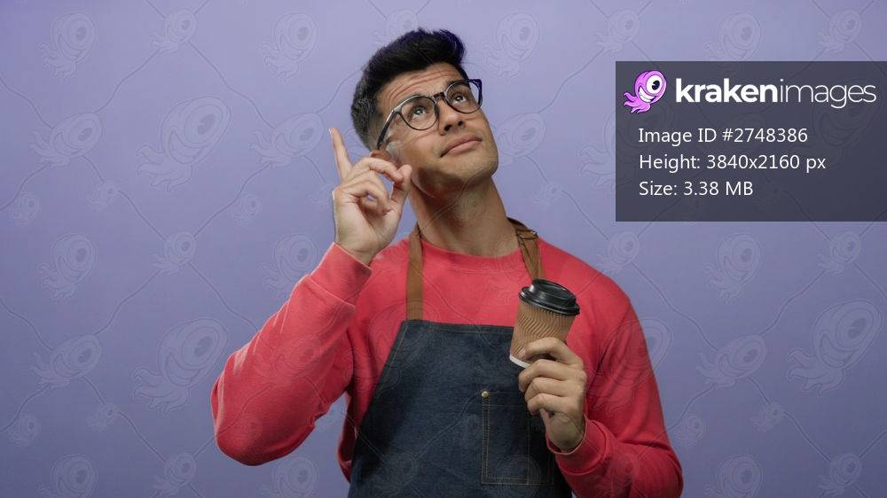 Young man wearing glasses and red sweater with apron, holding coffee cup, contemplating against isolated purple background