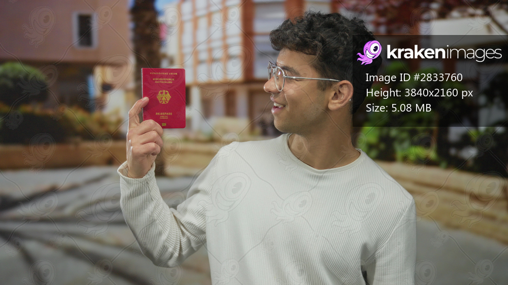 Young man wearing glasses smiles while holding red german passport on urban street with blurred building behind; pride.