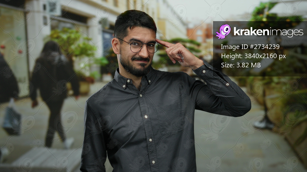 Young man wearing glasses stands on a bustling urban street, expressing thoughtful contemplation in a casual manner.