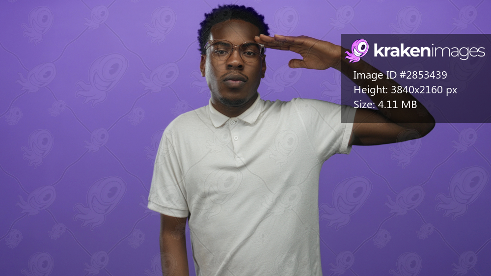 Young man wearing glasses and white polo shirt salutes with palm to forehead in purple studio; respect.