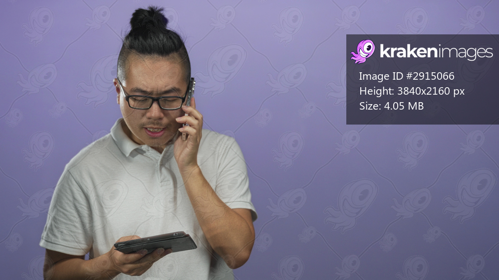 Young man wearing glasses and white polo talking on phone while holding a tablet in purple studio; frustration.