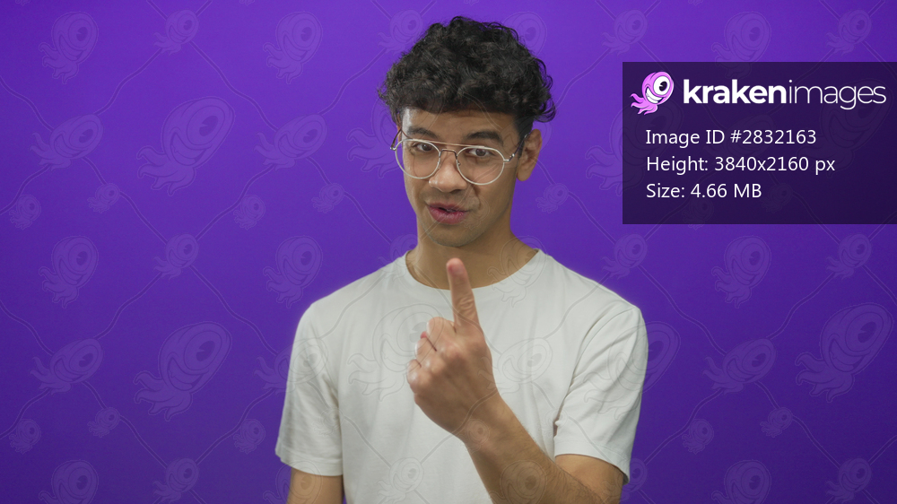 Young man wearing glasses and white t shirt holds up three fingers in purple studio; celebration excitement.